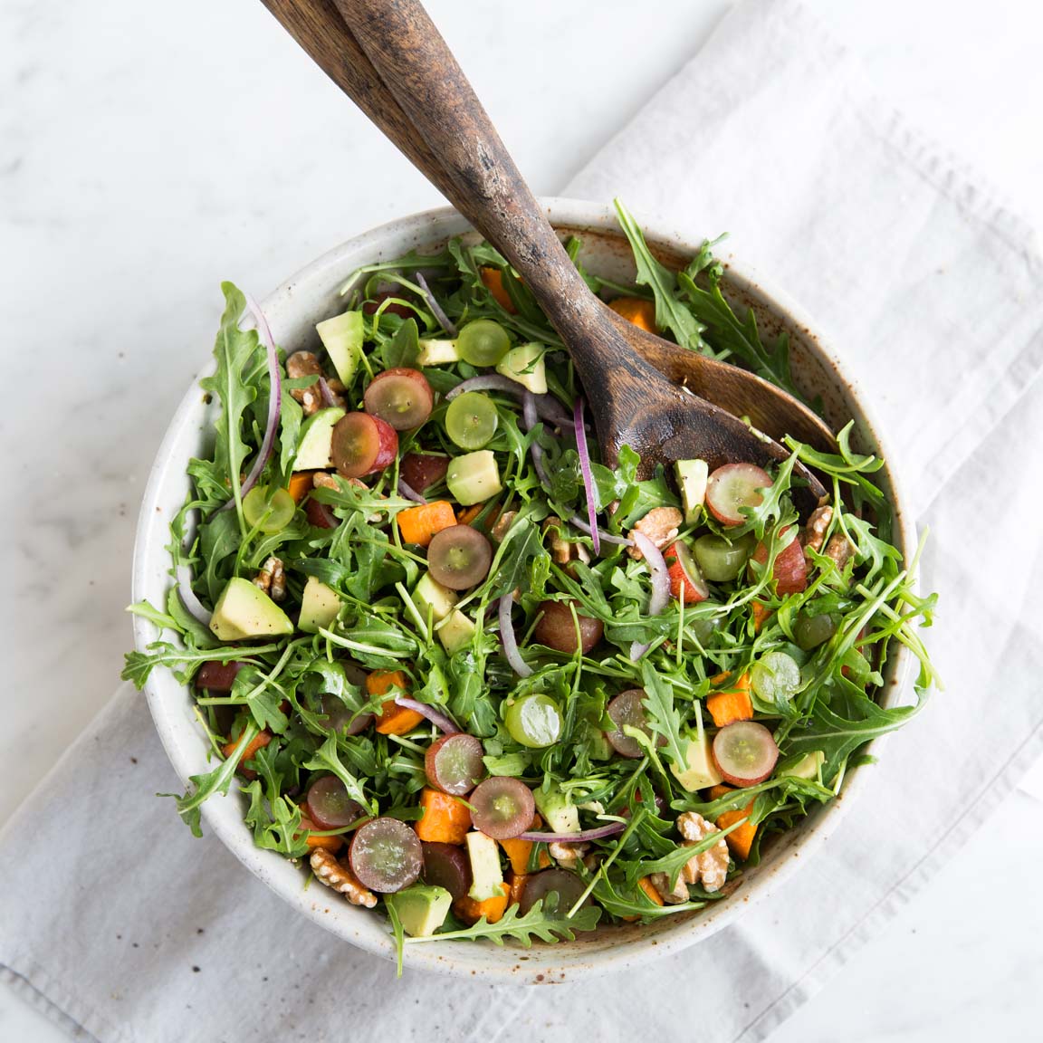 In a large salad bowl or platter, scatter arugula, grapes, toasted walnuts, onion, avocado, and sweet potato. Drizzle on the dressing, toss to coat, season with additional salt and pepper, and serve right away.